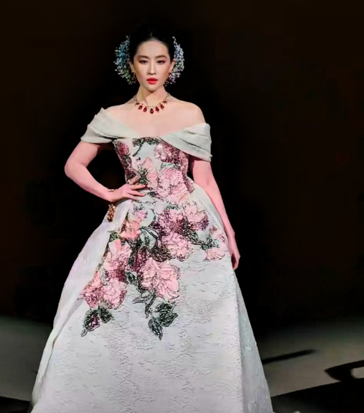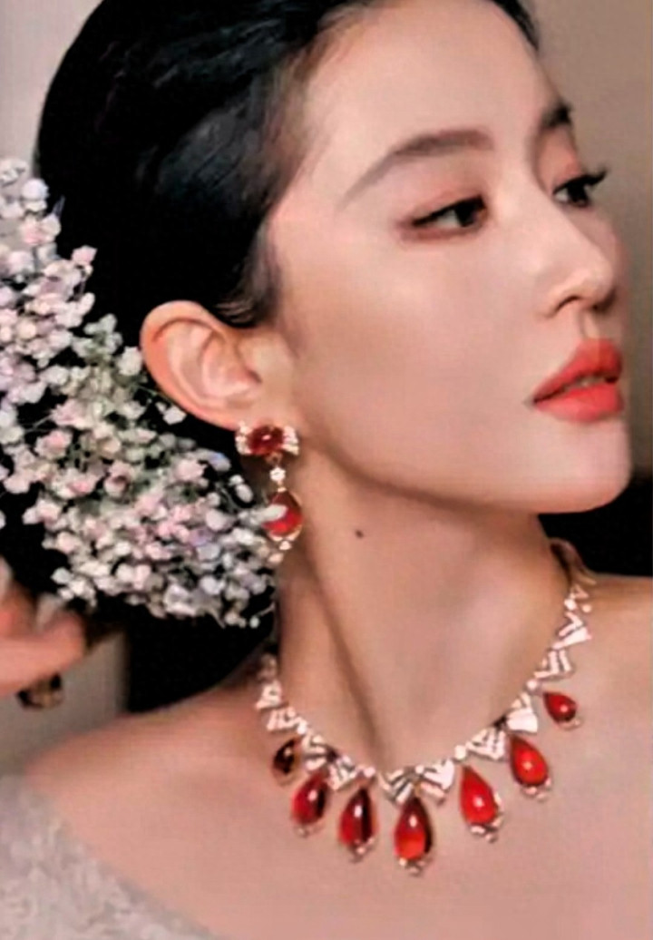 这回活动觉得女神刘亦菲最后一个登场。脖子上挂着硕大昂贵的宝石。会被很多人瞧见,闪到观众的眼睛。却出现了反转,女神刘亦菲出现在镜头时,观众竟然被她头发攒着的满天星抓住了眼睛。
